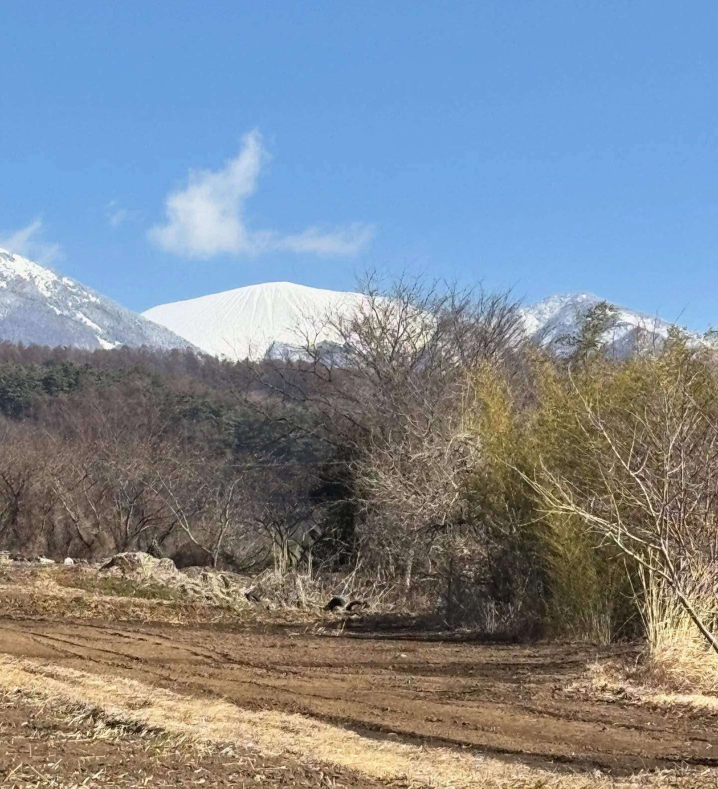 畑からの浅間山。雪をかぶると大福のように見えます
