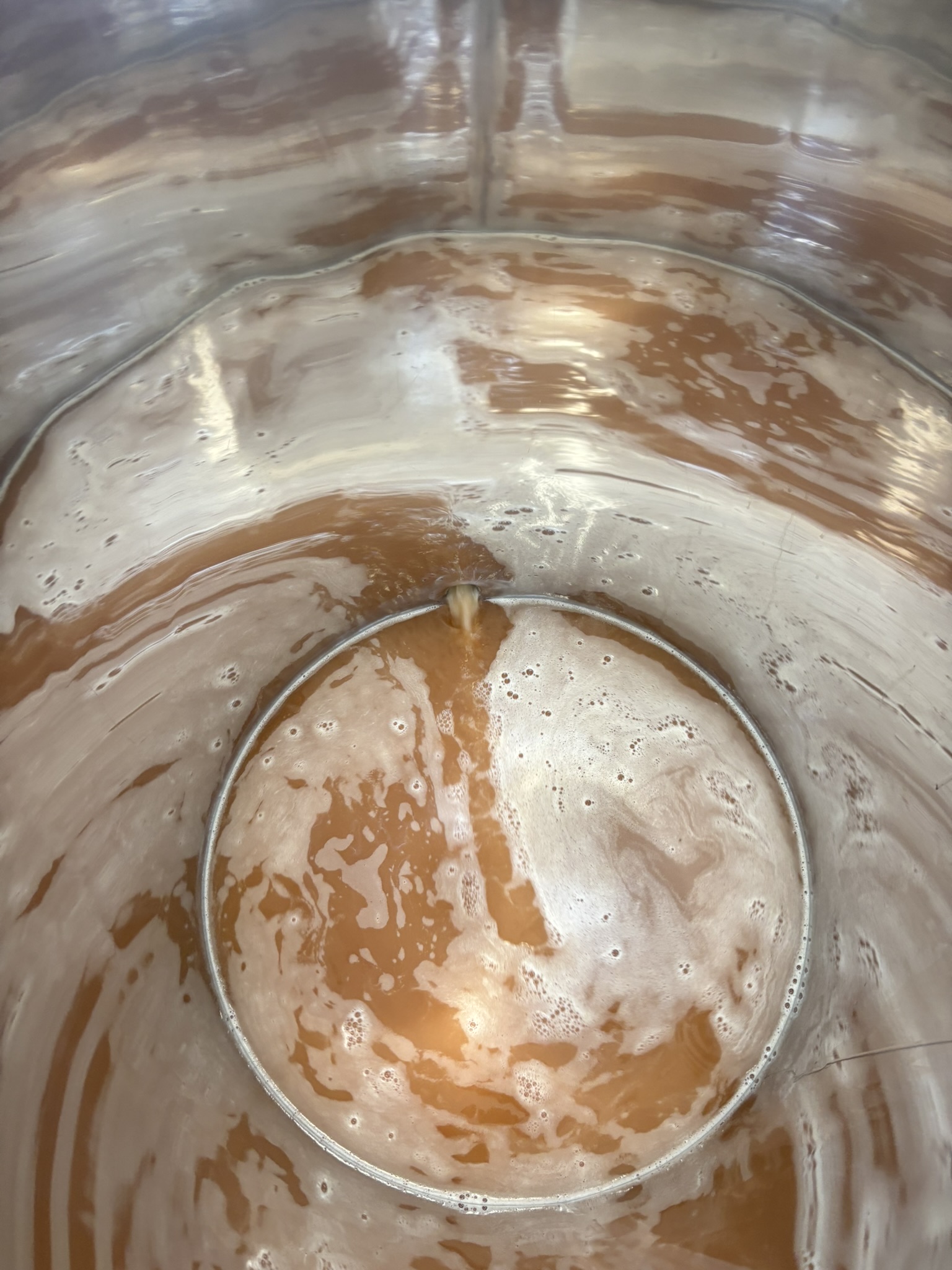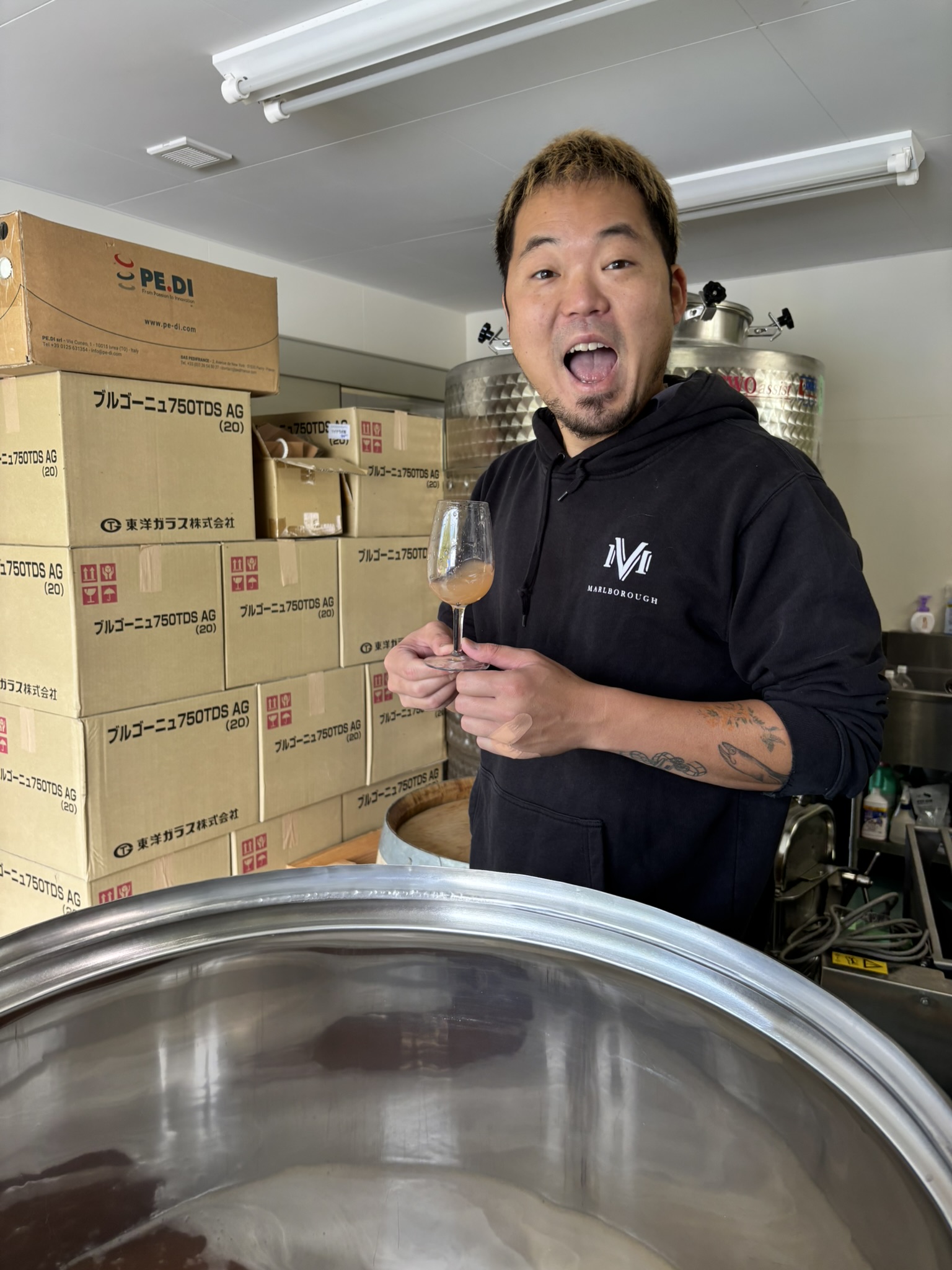 そのシャルドネと、ソービニョンブラン、フルミントを絞った果汁に、除梗したピノグリ、ケルナー、プチマンサンを皮ごと10日間ほど漬け込み、10月1日に搾汁しました。