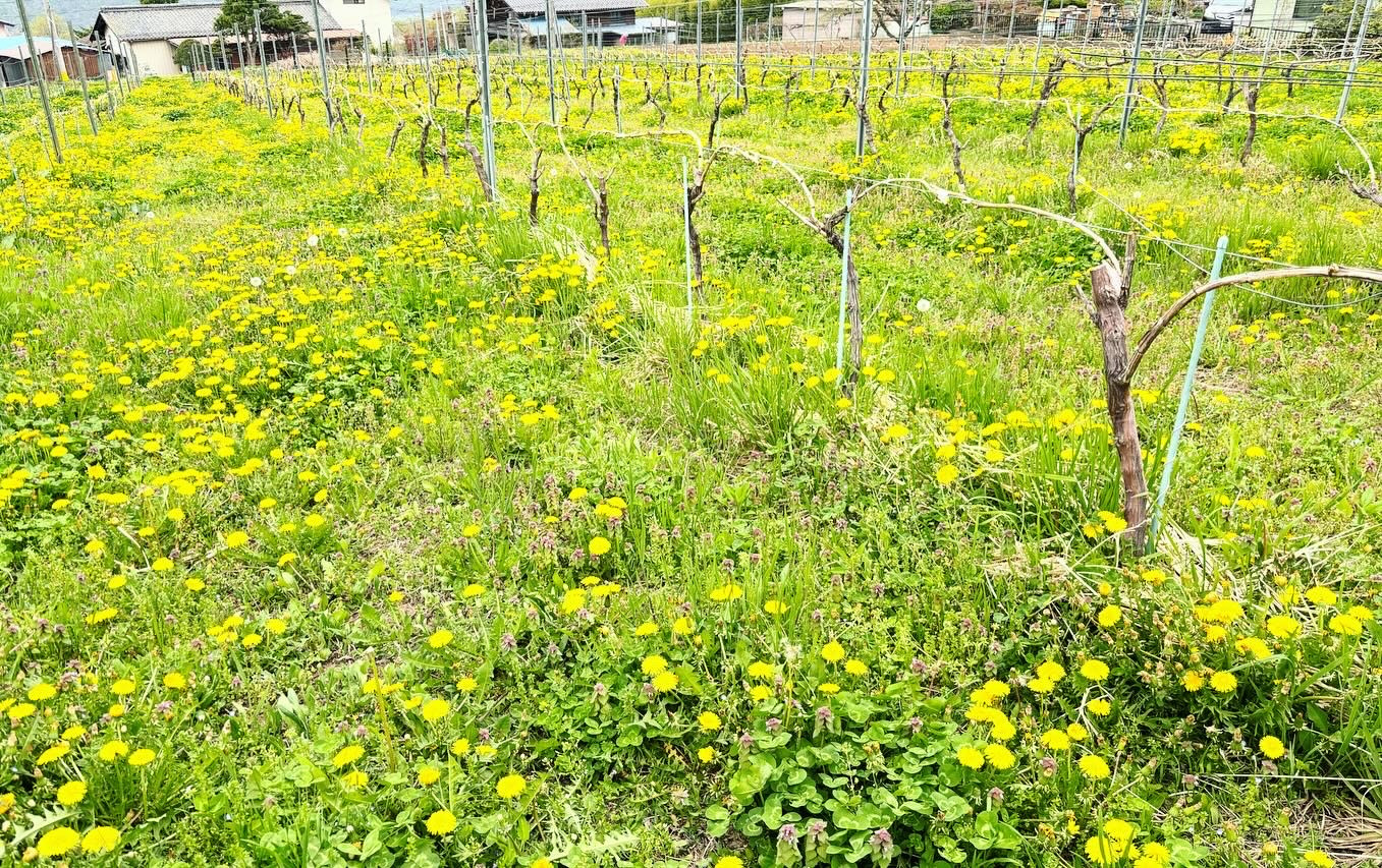 誘引が終わり、芽吹きを待つ畑は、タンポポに覆われます。